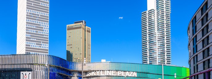 Das Skyline Plaza ist ein modernes Einkaufs- und Erlebniszentrum im Europaviertel Frankfurt, das 2013 eröffnet wurde. Mit rund 170 Geschäften, vielfältiger Gastronomie und einem großen Fitness- und Wellnessbereich zählt es zu den größten Shopping-Malls der Stadt. Architektonisch sticht das Gebäude durch seine geschwungene Fassade und das farbige, wabenartige Design hervor, das an eine dynamische Stadtskulptur erinnert. Besonders beliebt ist die rund 10.000 Quadratmeter große Dachterrasse, die als öffentlich zugänglicher Skyline Garden gestaltet ist: mit Grünflächen, Spazierwegen, Cafés und einem eindrucksvollen Blick auf die Frankfurter Hochhäuser.